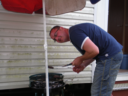 We head off to the kids holiday park at St-Jean-de-Mont, we are to spend the following couple of nights on firm ground, the first for many months. The park was well equipped for the kids, with play groups, play areas and pools, we joined in, rounding the evenings off with "the barbeque". Lee appears to have taken qualifications on this topic, so I allow him to take control of the cooking? The weather remains a mix.