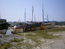 0930 hours a fellow captive calls us - "we can leave he calls". "When?" I ask. "It has to be now!" he replies. To support his claim a member from the Port Authority arrives to tell us the chain over the harbour entrance is lowered but he is unsure for how long. In less than thirty minutes we have cast off and are making our way down the river, not sure whether we will be seeing the place for the last time. We passed through the fish quay, the fisherman bidding us fare well as we pass the fish quay. We turn the corner and sure enough the chain was down - it was also letting the fishing boats out for their daily catch!