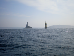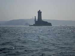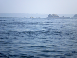 Moving through the Raz de Sein the dramatic Brittany coastline was spoiled by the sea fog.