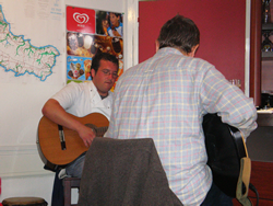 We continue to explore the Island, predominantly by road (bus/cycle) remaining based in our relatively sheltered cove at Sauzon. We get on with our chores, Kevin, planning and fixing, Ann, washing and cleaning. With no laundrette available Ann try's washing in sea water as fresh water has to be conserved as we are only able to enter the harbour at high water with the larger fishing vessels should we need to fill our tanks. The fresh water tap in the harbour is strategically place in amongst their berths, so replenishing our tanks is an interesting task as we have very little clue as to what is being conveyed to us by the local fishermen. With the bad weather, entertainment is sort inside, bars are few and far between, closing around 9pm even on a Friday night, restaurants obviously stay open until the customer is finished. We found some entertainment in the Hotel du Phare, at the harbour entrance. We observed a good old fashioned sing-song, any one could join in it appeared. One of the Chefs (from what I could gather) was initially reluctant to do so, after a number of songs the manager shouted "check on", in French obviously to get the guitar off him!