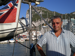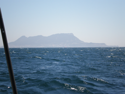 The wind came from the west as forecast and began to fall off, so we thought. We rolled up the genoa and started the motor, less than an hour later the formidable profile of the Rock of Gibraltar came through the mist, the wind also returned rabidly. As we turned into Gibraltar Bay it was blowing up to 30 Knots, with tide we were moving over 9 knots over the ground with just the main sail up. The finish wash to be a "sprint style", out of the mist from BEHIND US, came three vessel, enough evidence for me to declare us the winners! Remember it is the participation that counts, not winning! We raised the Gibraltar courtesy flag to celebrate.
