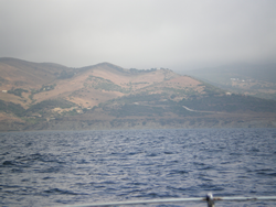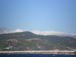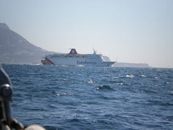 We slip our lines about 0600 hours, in darkness and make our way out of the harbour, south towards Tarifa - fog covers the coast line. As the daylight breaks we become aware of a further five sail boats making the trip with us from both the marina and the anchorage. A bit of an un official race developed, Sailaway and another vessel took a further inland passage (north of Bajo de los Cabezour, a series of shallows and ship wrecks), the rest went further south. Our interpretation of possible tidal gain? We were gaining up to two and a half knots of tide at times, but the outer vessels still made ground on us - better wind I think, we battled on! As I kept asking Ann if she thought they were making ground on us she would answer "Grow up - you do not even know them!" I obviously concentrated on keeping our speed up. The vessel that had taken the same route as us then turned south to join the rest, they disappeared into the fog - unfortunately du to the fog we could only just make out the Moroccan coast line. As we turned around Tarifa from our starboard side came the high speed ferry from Tangier at full speed, Ann was down below so I asked her to brace her self ready for the bow wave as it passed in front of us. I concentrated so much on the wave because of it's size I forgot about my own exposure to it, and I had the cockpit canopy down.