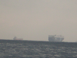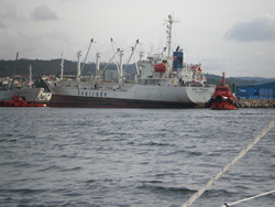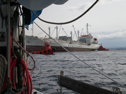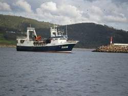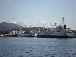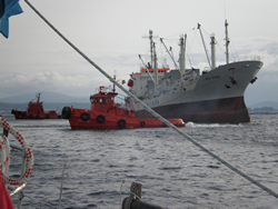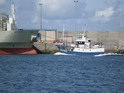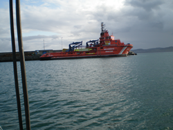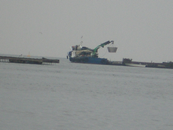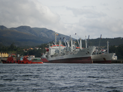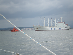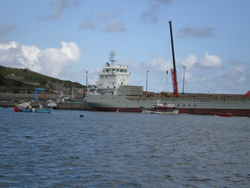 Two tugs secure themselves to the large coaster at the end of the harbour wall, they pull it from the wall then proceed to complete a 360 degree turn in front of us. The coaster and tugs then move back into the harbour and raft the coaster up against a coaster already secured to the wall. Within 30 minutes a fully laden coaster appears in the Ria, the tugs proceed to assist it into the space created by the activity - it now to unload its cargo!