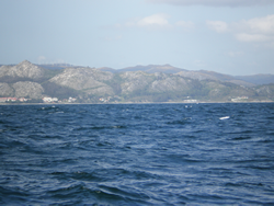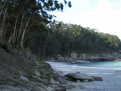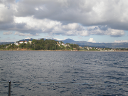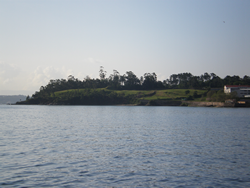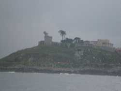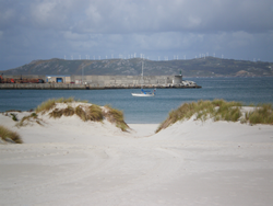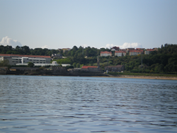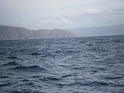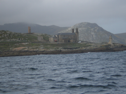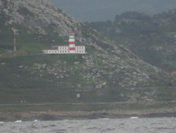 As we take the south channel out of the Ria, the 17th century church of "La Virgen de la Barca" (Mugia/Muxia) casts an daunting shadow. We head down the coast, passing the infamous"Cabo Finisterre", the dramatic view unfortunately spoiled by the mist! As we make our way down this coastline it is easy to under stand why it is known as "Costa da Morte", or the coast of death!
