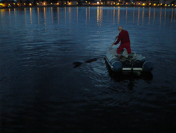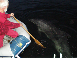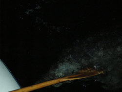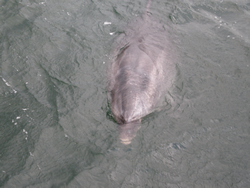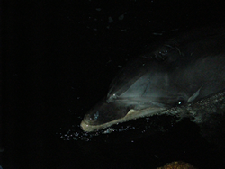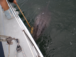Last night about 10pm we were watching a movie, we were disturbed by a light tapping on the hull. I went into the cockpit to find Chris in his dinghy - "I have brought some one to see you"! he said. Looking down onto the dinghy and Chris I was amazed - he had a dolphin, 6-8 feet long! I thought he was more of a blonde man myself.