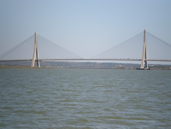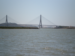Beyond the suspension bridge up river is large inland water way to explore, the intended trip is complicated as we have three variations of the bridge height which is quite critical, for our mast any way! We had enquired at the Harbour Master's office, a diagram supplied confused us further. Analysing all the data available the decision to go up river is made and off we go! As we approached the bridge the crew began to debate "how high it does not look", tension built as we approached the point of no return. The skipper demanded silence as he was confident in his calculations but he did brief the crew as to how to take cover should they hear a loud "crack" (just in case - non of us are perfect). The skipper remained fully focused as one would expect, we passed under safely of coarse.