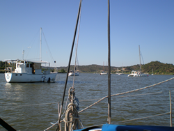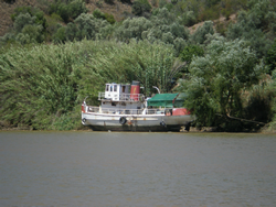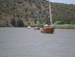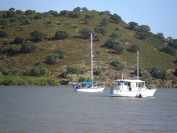 We continue up river, our destination is an anchorage between Alcoutim (Portugal) and Sanlucar de Guadiana (Spain) a further ten miles up river. This section was a little different to navigate, depths seldom dropped below two meters below the keel, the issue was debris, floating logs, rafts of bamboo etc. At times Ann took position on the bow as look out. We left with the tide, we were amazed at the cross section of vessels on the water way, and of coarse the many different nationalities.