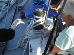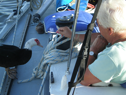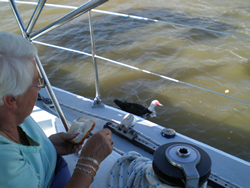 Sunday, being a religious day, after church we decide to take it easy, a break from the normal every day stresses of our existence. Ann (Mum) keeps her eye on all of the local happenings - not much gets past her! She makes a new friend, a duck from the Spanish side of the river, it soon gains confidence and gets up on deck. It feeds from our hands, and makes a daily return for its lunch. The other ducks are not quite as bold, but they do not reap the benefits.