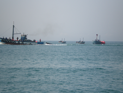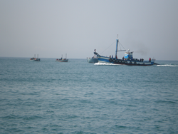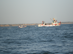 We sit aboard watching the world go by, the beaches are full every day, plenty of activity on the water also. There is the usual fishing activity, the dredger works the main channel and a freighter ships out the sand. Of more interest to me is the removal of a nearby "tunny net", three teams of vessels remove the marker buoys, the large steel cable and floating coloured markers. The numerous sea anchors are then lifted from the sea bed by converted fishing vessels, all components are then loaded into large barges and taken to shore. A later trip ashore astounds me as there are literally hundreds of these "ship type anchors" involved with these nets, all almost three meters tall. This nets removal will save us some time as we would have had to make our way around it, now our path will be straight through its original position.