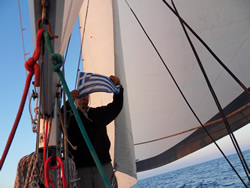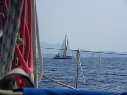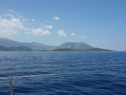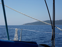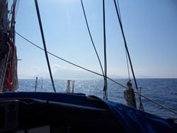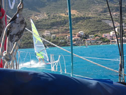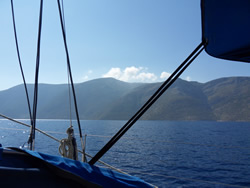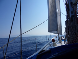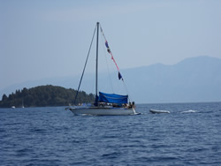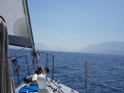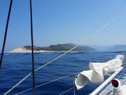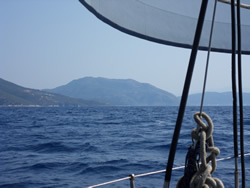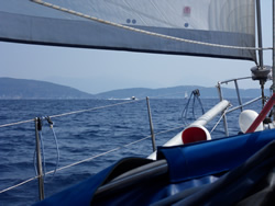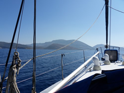 With our Greek courtesy flag flying we were well on our way to Levkas, on Wednesday the 5th, at 1800 hours, we spotted the Islands through the mist, both Cephhalonia/Kefalonia and Levkas, less that 75 miles to go! We had motored very lightly as and when we had to, monitoring and repairing our leaking heat exchanger when needed. Then a little good luck for us, we were hit by a un forecast, but very welcome strong north westerly winds (20/25 knots).