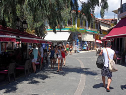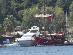 A further two hundred yards and "all change!", thanks to the the tourist industry, cafes, tavernas, and of coarse "charter boats". We sit in a cafe and watch, numerous boats moving in all directions, raised voices - no courtesy what so ever - glad we stayed out. We watched one charter company bring in under instruction, about six vessels, once they got the hang of tying up stern too, after two or three attempts, they were left to it - god help their next port of call? Their arrivals took up about a good hour of our time, but we were shaded and watered so all was good for us.