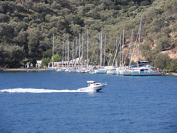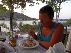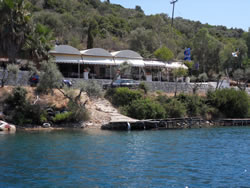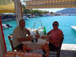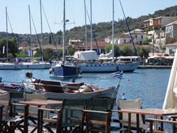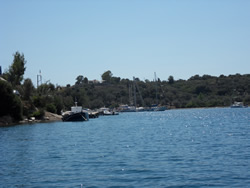 After some waving and shouting between us and the taverna staff we pick up the only mooring buoy outside there small marina, the marina being fully equipped with water and electric. As is the norm the port is also serviced by ferries, as we have buses, they have ferries? We have a restful day, in the afternoon we take the dinghy ashore to sample the local beers, make our acquaintance with the proprietor, and of coarse end up back there in the evening? We spent a couple of hours, over a beer watching the taverna, they were turning away vessels, tell them to come back the day after tomorrow as they were fully booked. Then the charter vessels began to arrive, that kept us entertained for some time, they did well, packed the boats in like sardines. The food was good, we ate too much and upon settling the bill we were asked "what did you have?" - just like back home? We did not stay late as we were suffering due to the amount our stomachs had taken in, but we slept well!