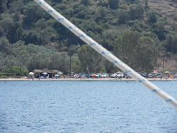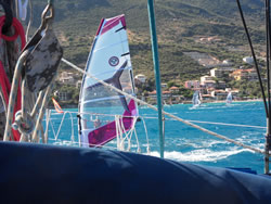 We find the restaurant and settle down for a long lunch, the recommendations were accurate, the staff very pleasant. We had a lovely local lunch complemented with local wine. Our return to sailaway was also interesting, the wind had gained strength now about 25 knots, the waves were soaking us. We also had to make our way through now an intense field of "high speed" wind surfers! We had a good laugh, but climbed back on Sailaway soaked to the skin.