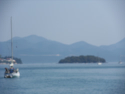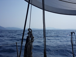 We were able for a time to reach 4 knots in 6 knots of wind, for the next couple of hours, canvas was up, down, engine on, off, still we have the time. In the distance we can make out Ithaca through the mist.