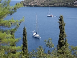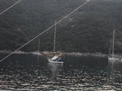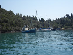We now plan to head for Port Vathi, heading east around the island, Vathi is the acclaimed capital of Meganisi and it's 2000 inhabitants. We look into the small harbour but it is quite full of vessels, the bay it 'self offers little opportunity to anchor other than another taverna and it's mooring facilities - no thanks! We decide to move a further few miles to the east to Ormos Kapali. It is a secluded bay, nothing other than water and trees, and of coarse other boats.