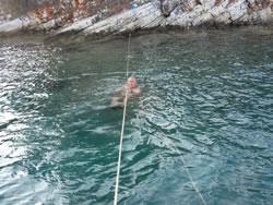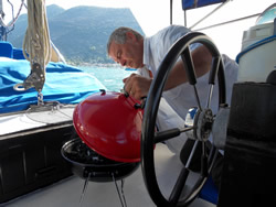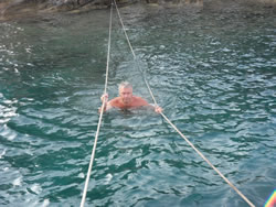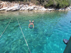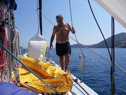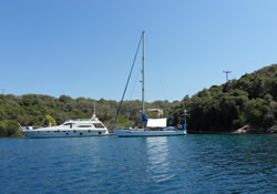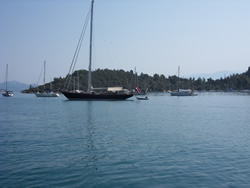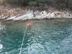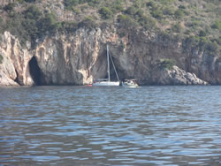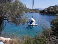 We arrive in the bay, it is almost empty, the depth of the water and it's quickly climbing shoreline requires that we drop our anchor and lay a line ashore, tying to a tree or rock? This is a first time for us, excitement grows but "Captain Panic" is clearly in full control. We drop our anchor in about 25m of water, another British flagged vessel is on our starboard (right hand) side. The wind is across us, in theory pushing us onto the along side vessel, we put Sailaway into reverse and balance her against the light breeze, she is now perfectly positioned relative to the shore. All we have to do now is get a line ashore and tie us up before the wind changes? I, "Captain Panic" jump into the dinghy, instructing Ann to pass me a greyish anchor rode (rope) I begin to row ashore as Ann feeds the rode (rope) out - seems quite simple, even for a first time? No, I get about 5m from the shore and I run out of rope, it's too short - silly Ann? I have Ann pull me in by the gray rope, we clearly need our green (100m) anchor rode? Sailaway continues to sit true and Ann begins to feed me out the green line as I row to the shore. As I reach the rugged, rocky shore I leap into the water holding both the dinghy and green line and begin swimming to the shore, I quickly realise the water is only one meter deep so to Ann's surprise I stop "battling the tide", stand up and walk ashore? Known as "Captain Cautious" I demand a second line is set, and we do so - it is now time to relax?