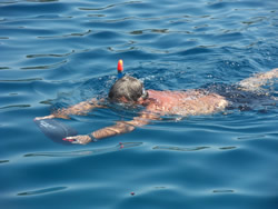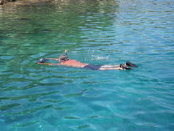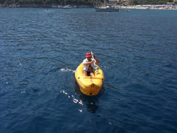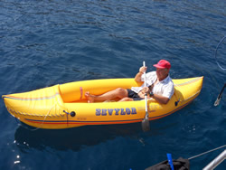 The next day we rise early, and first of all snorkel, we then did out the inflatable canoe we bought in Sardinia second hand, once blown up the challenge is then to climb in - mission accomplished. We take the canoe around the bay, putting in a couple of hours of our precious time!