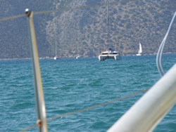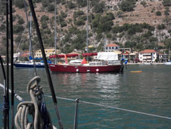 Getting our bearings turned out to be quite difficult, looking for a bay on a hilly shore is hard enough, but the landscape was further confused by the nearby island of Meganisi, even the channel between the two (Levkas and Meganisi) looked like a bay from our position? Still, establishing our bay's position, we came about (put the sails on the other side because of the wind, to the less nautical minded!) and sailed into Ormos Rouda.