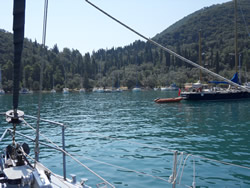 We head further towards the town of Vliho in search of Wayward, this Ormos, provides excellant shelter due to the mountains but it also is extremely hot! Eventually we find Wayward and we drop anchor a head of her. We make Sailaway secure and drop our dinghy, it is clear there is no one on board, but we knock any way. Beki and Eamon have secured work locally, so we assume that is where they will be? We decide to head back in the dinghy up to Nidri, we take the computer as it is some time since we checked email. It is quite a journey up to Nidri in the dinghy, but it beats walking, especially in this heat.