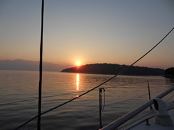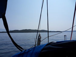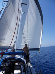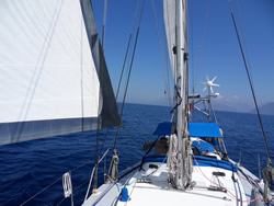 We had gone from almost no wind, to a welcome "blast", we were now reefed, still making 6 to 8 knots. The wind was on the beam, as was the resulting high seas, 3 to 4 meters at least, still we were making good progress. "Feast or famine" as we all know it as? It continued to blow through the night, the building, breaking waves on our beam flooding our cockpit at times, still the water was quite warm! We made our way across what seemed to be shipping lanes, not charted but heavily used, as usual we had a mix of good consideration from most of the freighters, only one vessel forced us to take avoiding action! We were less than 15 miles from our destination when the wind began to drop, we increased sail area to keep up our speed with what wind we had, then the wind went completely. We were back to our "limping engine", we kept as much canvas up as possible to give stability as we slid down the waves as they continued to approach us from the side, it was a good 3 hours before the sea had fallen to less than 1m.