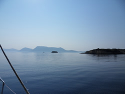 With "Captain Cautious" clearly at the helm there is no concern with regards to traffic, some vessels literally move a few hundred yards in this vast bay to change scenery or neighbours? As you exit the Ormos (bay) the island of Madhouri stands between ourselves and mainland Greece, it's mountainous coast line unfortunately continuously masked in a haze?