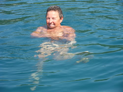 The sandwiches were fine and our custom appreciated, we left to return to Sailaway, our swim wear and towel was now dry on the rocks, we changed on the roadside and swam our way to Sailaway, a good day had by us both!