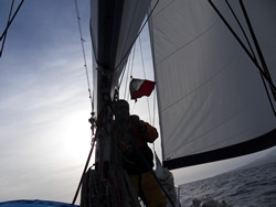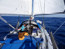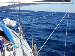 Very soon we come across numerous dolphins, they spend about three hours with us, very unusual, they must have been really bored? The sea now falling considerable making the sailing more pleasurable.