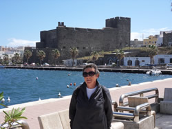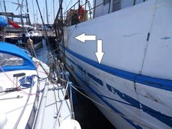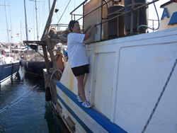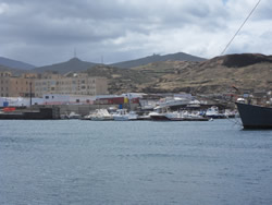 Sailaway is secure along side a fishing boat, the wind catching our mast and pushing us off the adjoining vessel, the fisherman have left their boat so we are unsure when they intend to move again? To get ashore we have to pull Sailaway close too, climb aboard the fishing boat and make our way along a narrow ledge (less than a shoe width) holding on to a guard rail above. We make our way to the stern of the boat, climb across it and up onto the harbour - keeps us fit!