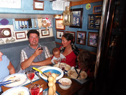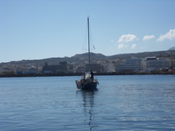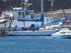 The area was a little confusing as it had been changed significantly from the information we have, a number of vessels where "rafted up" against the harbour wall. We recognise one boat instantly (Sylvain, Amelie and their children), we shout over to Sylvain to enquire as to how the harbour works, is there any one in charge? We are then beckoned over by a fishing boat to tie along side, we are too large to tight up on the end of either one of the rafts of visiting boats. We tie up with both the assistance of the fishermen and Sylvain, as we do so we then recognise the sailboat on the end of the raft, "Preban (Peter, in English) and Dolores", we had met them in Cagliari (Sardinia) last year. Once tidied up we join them for a couple of drinks, they had arrived a couple of days ago have spent the last year in Tunisia.