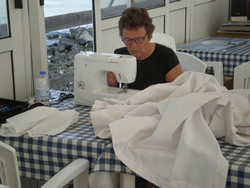 Before you know it, with the help of friends, and a manual down loaded from the internet Ann is off! If it is stationary long enough, it is being stitched! It is at times like this one reflect back, to a previous life where, if a button came of a shirt, it was dumped? Apart from needed repairs Ann makes a large boom tent, which is supported by our boom giving us excellant protection from the sun.