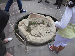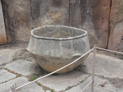 Above, left is a "ring stone" to which it is believed the beasts were tied before the sacrifice - the area shared with a Salamanca at present. Once killed and dissected the body parts were placed in a furnace (centre picture) and burned. As the ashes, in theory would have belonged to the Gods, they were stored in the square stone storage jar below the furnace.
