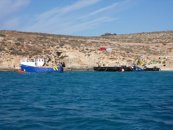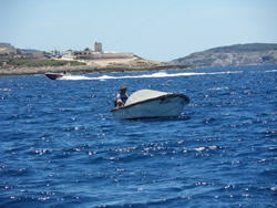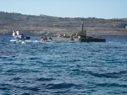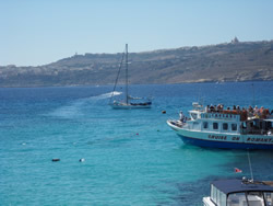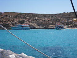 We eventually find a kind window to allow us to take Mum to the north of Malta to the island of Comino where we look to spend some time at the "Blue Lagoon Anchorage". The winds are moderate north westerlies so we have to beat against the wind to the north covering about 20 miles in total to make approximately 10 miles over the ground. Still, mum, takes it well and enjoys the five hours at sea however, on approach to the anchorage we are stopped by a police rib. We are informed that they are to tow a barges out from the small harbour and we must stay well clear - we have no problem with that.
