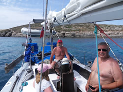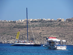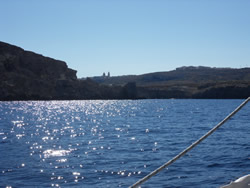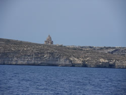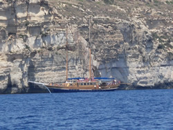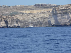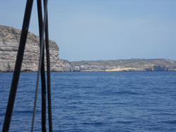 In the morning, life jackets are fitted and final plans completed for the next few days, the weather forecast looks good for the next three days. Dave and Hazel have had a boat before so, we pay our dues and slip our lines to head north towards Comino and Gozo. Once out of the harbour we raise our canvas and head north, the winds are a light north west so we tack up the coastline, time is not an issue we are only 10/12 miles form our destination. Every one settles in very quickly to the slow pace, our speed only 3 knots or so. Hazel, be it the salt air, or sea sickness tablets show signs of weakening very quickly, soon she retires down below.