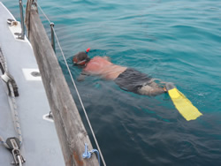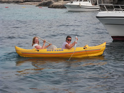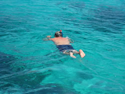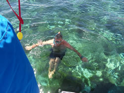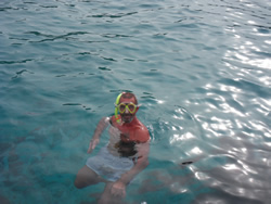 Once inside, due to the time, most tourists where gone, the girls wanted the canoe inflated, once in off they went. Dave and I gathered our snorkels and took to the water. I need lots of practice, Dave is a good help.