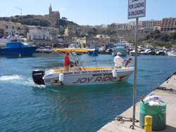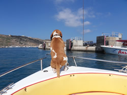 We decide to take one of the many water taxis from here, the Blue Lagoon, over to the port of Mgarr on the island of Gozo. The island of Gozo is about six miles long, three miles wide, with a population of about 30,000. The trip itself is only some two miles across the channel, however, too far for our small dinghy out board. We wave a couple down before we can get a reasonable price, and a pick up from Sailaway - our taxi comes complete with it's own sea dog "Lucky".