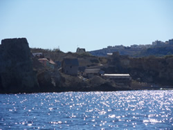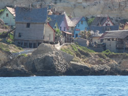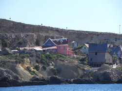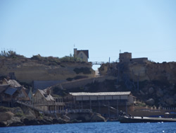 We leave the Blue Lagoon anchorage early, this weekend is a holiday weekend, yesterday the anchorage was completely full, we wanted to leave before it became too crowded. We had also planned to stop off at a small anchorage on the north west corner of Malta call "Anchor Bay". It was described as "a small, narrow bay where, at it's head stood a village created for the making of a Popye movie". This must have been some time ago but, it sounded interesting? We had previously tried to get their with Dave and Hazel, but the weather had been against us - to day was flat calm, with little or no wind.