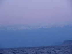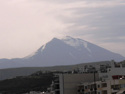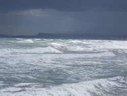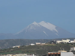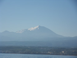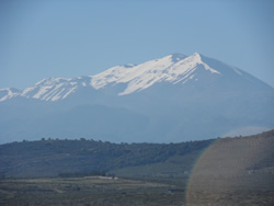 We watched the wind and weather around, the wind was again now steady and a good twenty knots, out went the head sail and off went the engine. The head sail was large enough to give us 5 knots plus and a much smoother ride than the engine in the building swell. The snow on the Psiloritis ldi Mountains was now more visible however the weather around spoiled any opportunities of good pictures.