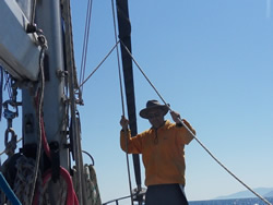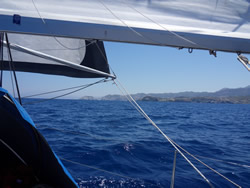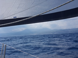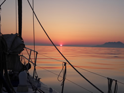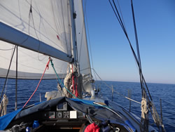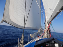Once clear of the headland the winds are light but useable, up goes the canvas and off goes the noisy, but necessary engine. We watch Crete slowly disappear into the mist.