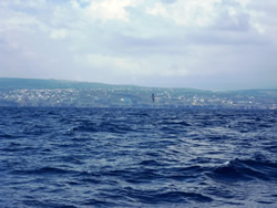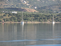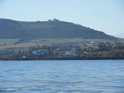 And guess what, as we gained out side visibility approaching the harbour entrance the freighter's anchor was indeed just appearing out of the water? We took a coarse due east along the beach to allow clear access for the vessel, an old naval saying "if they are bigger and/faster than you - stay out of their way?" That's just what we did, we watched as she slowly passed us and turned into the entrance making for the west quay. We re-adjusted our coarse, heading for the headland "Ak Khondros Kavos." We still had a slight southerly, northerly forecast, but who cares - up went the canvas and off went the engine, we were making a good 4 to 5 knots and no noise - perfect!