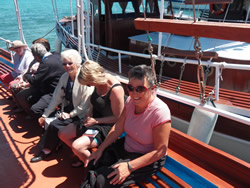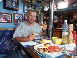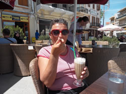 Today with such a lovely day we head into town, we have not been off Sailaway for two days, nice to feel the firm ground occasionally under your feet. As we do, we decide to have a drink in one of the small cafes in the square - and of coarse "people watch?" There are now so many pale/white tourists dressed in shorts and floppy hats? This is our first trip to this cafe, Ann's attention is drawn to the picture advertisement of a floured ice-scream drink. Further discussion with the waitress reveals the total lack of calories within the drink, especially the mocha flavour? The young lady is some what taken back when I accused her of saying any thing to get a sale? Ann ordered the mocha flavour in good faith, but after wadding through the ice scream begins to question about "the total lack of calories, a little unbelievable?"