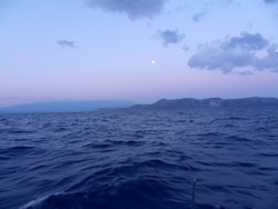 With day break calling on us again Crete was now clearly ahead of us, Ak. Maleka, the great head land north of Soudha could be seen, in the distance snow could also be seen on the mountains, that made us feel even colder? Soudha was the great NATO Naval Base of the eastern Med., lots of restricted waters around, Submarine training areas and all that good stuff. We were now only a few miles north of 30 Degree's, it is here the Lybian naval embargo begins, effectively a war zone, it was hard to believe we were now actually so close? We are so detached from the real political issues as we take little interest in the news, for two selfish reasons, firstly, it is always bad, and secondly, it has little effect on us, living as we do, other than the exchange rate!