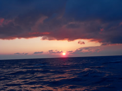 The wind now picked up from the west, up went our canvas and off went the noisy engine - peace again at last. We were now once again making great speed through the flat water with only a very shallow swell from the north as we had become accustom too. In a matter of a few hours the sun rose fully to the east of us, it's light producing an angry coloured sky - "red sky in the morning, sailors warning" as we seafarers say? The wind began to stiffen, we now had over twenty knots of our starboard stern quarter, great sailing!