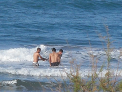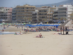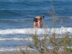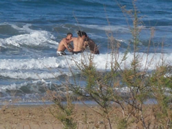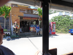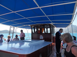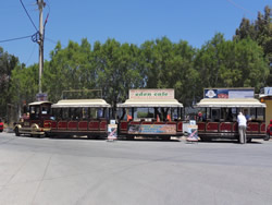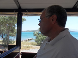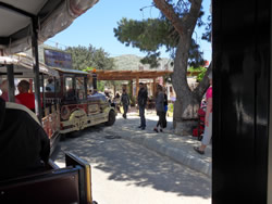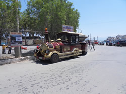 We are soon off, first of all skirting along the waterside tavernas, the driver sounding his horn/bell and the proprietors, staff and the less miserable guests waving back to us. I think this train could be a superb "babe magnet", the amount of women that appear to be waving just to me is unreal, most of them do seem to have small children on their arms but I do not think that is an issue? I explain my theory to Ann - she seems unconvinced some how? A lot of the waterside hotels have small, what appear to be man made beaches on the other side of the road, numerous white people burning themselves?