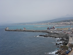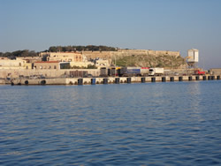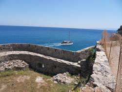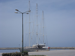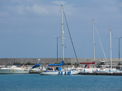 We very quickly made up the ten miles of so, the harbour wall easily identifiable to the east of the large impressive "Fortezza", we in time started up the engine, rolling up the head sail we surfed into the harbour on what was now a good two meter swell. A freighter was being loaded/unloaded on the commercial quay, we were to make our way into the marina. We had been told by friends we had met in Pilos that it's costs were cheap and they were "nice people". We hung around making our intension's to enter clear in the now stiffening wind, no one came to offer assistance or guidance, the wind strength was going to make berthing interesting, we decided just to enter and see what happens? As we began our entrance in amongst the pontoons we were welcomed over to pontoon "A" at the entrance by a gent off another boat, he was along side, he was pointing to a space between his bow and an eight meter sailboat which was "bows too" on the same pontoon. Within moments the couple from the small sailboat were on deck, others had joined on the pontoon to offer assistance, or have a good laugh as we "messed up" especially in the cross wind? Now with the ongoing communications sailaway had been blown past the pontoon, a number of berthing options were being given on "Pontoon A". It was clear there were pick up lines, we chose the best option for us, we would turn around and take the first berth offered, this would allow me to cruise in abeam to the wind which would blow us on to the small sailboat. The sailboat would hold us in position until we tired up! Selfish I know, but the best, and certainly the less humiliating for us as the wind was now very strong? We entered the berth as planned and tired up with perfection, the 10 mm lead lines we were give by the crowd never brought up the main/thicker lines, these berths were clearly for much larger vessels? We secured Sailaway with the 10 mm lead lines, alongside vessels had done the same, I asked questions about the organisation of the marina but got no clear indications. The lovely people who had offered assistance were the "winter community" we had been told about, two vessels nearby were visitors. The wind was now too strong to reposition Sailaway so we secured a couple of these 10 mm lines to our stern and further lines to the quay to keep Sailaway off our neighbours. We now needed a good fry up and some sleep, the marina staff seemed uninterested in us so they could wait.
