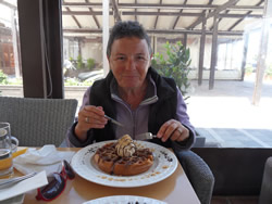 We walk along the water front as not to have to "run the gauntlet" of the bar and restruant owners all toting for your business - not that we are cowards, it is just easier to stay out of the way? A lot of the establishments are closed, a couple offering roast lamb on their menus - some even offer to take your photograph by the roast - no obligation to eat of coarse? We are looking for some lunch but Ann has her favourite place in mind, a waffle cafe. We called in a couple of days ago, tried one between us, it was beautiful, the owner advised Ann as to which flavour ice scream she should have with her "Nuttela Waffle" next time. This time we have to have one each as I cannot have any of hers - expectations were clearly met!