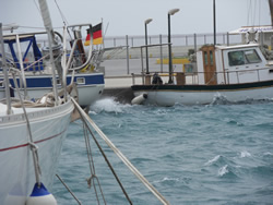 The weather has definitely warmed up over the last week, our early arrival on the island had initially been greeted with much colder temperatures that the islands to the north? For the most of yesterday we had been subject to southerly gales, gusts up to 40 knots we were told? Our aging instruments gave up at 35 knots, but the wind could be heard accelerating past that. The gale had been forecast for three days, therefore we were prepared, we had gone "along side" on the pontoon and had used the traditional "tailed lines" to hold us off the pontoon. Inside the marina, especially those boats on the north wall, had their owners duly occupied trying to reduce the effect of both wind and waves pushing them hard against the quay wall.