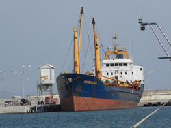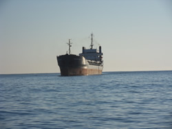 We always sleep poorly the night before a trip, we woke early that Sunday morning, our plan was to leave as close to day break as possible, as we sat with our breakfast we could hear dozens of those noisy tourists making their way along the water front, back to their beds - disgusting! There does not appear to be any where here to complain about their behaviour, good job we are leaving? We loosen off our lines from the stern and the bow lines from the pontoon and moved away from the quay. We had paid up until Monday so we lost one nights berthing costs but at €1.50/night, not a great loss - thank god for all that EU investment that paid for these marinas? We sit in perfect calm in the harbour, with only a breath of wind. This allowed us to complete our tidying up in the harbour, fenders, ropes etc all stored in their proper place. We knew of a freighter that had arrived yesterday as we sat in the taverna and dropped anchor outside the harbour. The quay was full of loaded trucks ready to load up the freighter "All we need would be for that freighter to lift it's anchor and make it's way in as we were leaving?" I said to Ann.