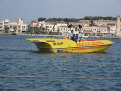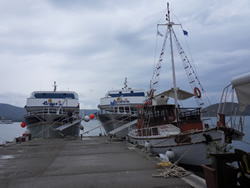 The commercial section of the port had two arrivals last night, two cruise ships belonging to the same company. We had seem "Panama" the large sailboat two weeks previously in Pilos to the north, already in operation. Both of the vessels are being cleaned, washed down paint work touched up, Ann sees "completion" with regards to the paint work, we both agree Ann's methods are far more professional. As we sit aboard Sailaway a working boat is launched, a power boat called "The Beast" (what else) ready for the seasons parasailing.