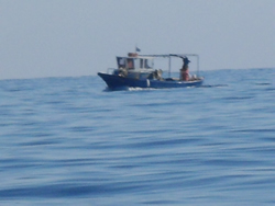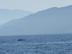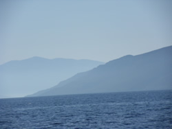 In time we round the two islands, as doing so we are joined by a small group of four dolphins, slowly and gracefully moving through the water only a short distance from us. In time, through the mist the island of Rhodes appears in the distance.