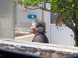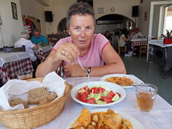 We are then invited to have a drink or food in the family taverna across the lane. There is no menu, you take what the family have made that day - or not? We have eaten at these small, "traditional tavernas" before - no all day "Full English, nor "Fish & Chips" here? We are told that all of the produce is made by the family, the Greek Salad and bread is mandatory, with two vegetable dishes offered, we share one of each between us. We wash it all down with their home made wine, rather strong and potent, it tasted very much like a fortified wine - importantly it went down very well. All for €11.00, it would have been easily twice that in one of the resort type town - good value and excellant quality. We all bid our farewells and climb back onto the road train, the proprietor comes out to see us off!